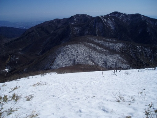 8時9分にはいっぷく峠で群界尾根に出られました。前回に比べて断然早いペースで来られた。郡界尾根の雪はかなり融けているし一度融けてしっかり固まっているので歩きやすくどんどん進める。三人山の前山は痩せ尾根の急登を左から巻くのだが、その辺りにトレースが残っていた。トレースの主はこのコースを熟知しているようだ。前山のピークも右側をちょっと巻けば楽に越えられるのだが、忘れていて真っすぐに越えようとして手間取った。
