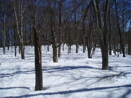 東端から南尾根をゆっくり滑っていく。尾根が急こう配になる前でランチ休憩にしスキー板を外しブーツも履き替えた。急こう配の部分はタップリの陽を浴びて雪は融けていた。雪が残っていても樹林が濃くてスキーでは下れないところなので予定通りの滑降終了だ。