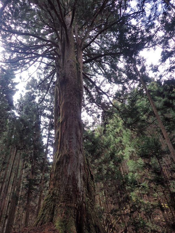 地図にある巨大堰堤を越え深山国有林に入っていく。林道下には昔の石垣道が見える、登山口より山道に入る。尾根の取りつきには両側が石積みで守られた道があり多くの人が利用した道だと感じさせる。杣道を進むと千年杉が出てきた。樹齢数百年の杉で多くの人の営みを見てきた。この先の谷筋で破線道は崩れ右を巻くように道はつけられており、上り切った所に夫婦杉が立っていた。植林の木と比べるとその大きさは圧倒的だ。