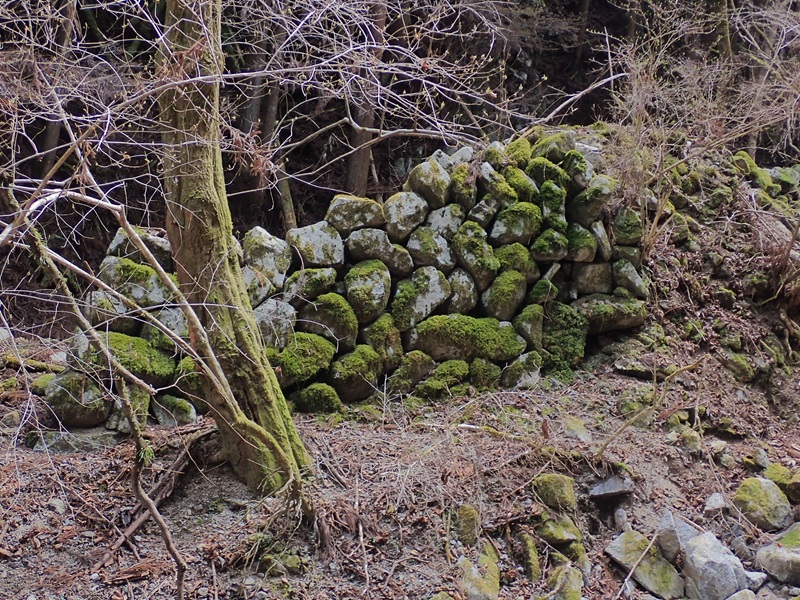先の二ノ峰には二段の強固な石積みの上に石尊大権現が祀られていた。たくさんの人が参れるという利点はあるが、磐座の無いピークで本来の意味合いは薄らいだように思う。本尊は不動明王と書いてある。隣に「南無妙法蓮華経」と刻まれた六部供養塔があり、松阪の鈴木治右衛門昭成が天保6年(1835年)に立てたと書いてある。街道筋ではない山頂付近に立てて世の平安を願ったのだろうか。山頂までピストンして二ノ峰に戻り、谷・都方面に下山する。夏明道は石尊大権現までコンクリートの道が続いていたが、こちらは昔の溝道がそのまま残っている。自然林のまじった明るい山道で気持ちがいいい。矢下道の分岐には「左谷ニ至ル 大石駅約47粁」と書いてあるコンクリートの道標がある。粁はkmのことで、ここから大石まで4.7kmあるという意味らしい。大石駅は60年前には無くなっているので、それ以前に立てられたようだ。次に山道との分岐が出てきた。ここにはコンクリート杭の横に自然石に同じ文字が刻まれている。こちらは松坂・津・伊勢方面からの参拝者の多かった江戸時代のもののようだ。尾根を下っていくと大きな家が出てきた。地図を見ると廃村になっている大城集落への分岐で大八車が通れるコンクリートの道が続いている。登山道は都集落に向けてトラバースしていく。紅白の梅や建物のあった石垣に茶畑の跡と里山の空気が濃くなる。谷川沿いに下り谷集落に入っていく。ここの石積みも夏明と同じくほれぼれする美しさがある。集落の入口に大日堂があり大日如来が祀られていた。