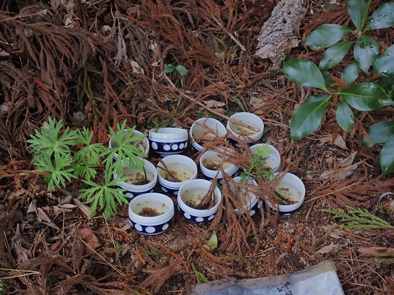 一の宮が健脚コースの分岐になっており、上り返す。健脚コースは沢筋の炭焼窯をつなぐ道を下部で使っており、沢登りの巻き道のような感じだが道は続いている。林道に出て再び山に入った所に湯飲み茶わんが12個きれいに並んでいる。朽ちた看板や説明書きがあるので読むと、「終戦直前の昭和20年3月に海軍軍用輸送機がここに墜落し昭和54年に全搭乗員の身元がわかり現地供養が行われた。」という新聞記事が貼ってあった。12名の搭乗員の中には、中曽根康弘首相の弟もおり、中曽根氏が遺族代表の挨拶を行ったと書いてあった。手を合わせ、尾根を進むとやせ尾根が出てきた。木の根頼りの急な尾根を登っていくがこれが長い。なかなか終わってくれないなあと嫌になってきたあたりで本コースに合流し、ひと上りで山頂にもどった。
