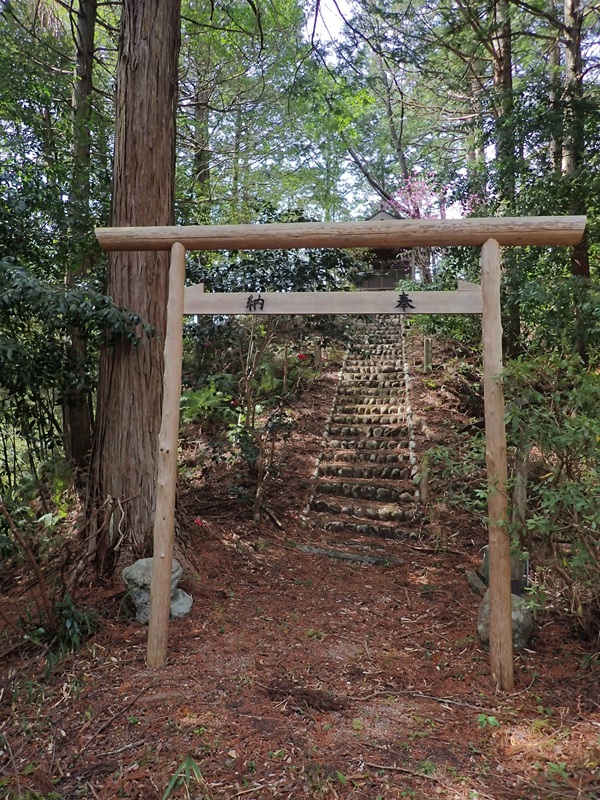 局ヶ岳は西の嶽山と川上若宮八幡宮では呼ばれている。東の嶽山と呼ばれる高見山との間にある川上十三峰を神体山としており修験の行場となる磐座が点在している。山頂からは来た道を戻り、小峠から旧道を下る。整備された道を下ると下部で磐座に古木がからんだ大岩が見える。下ると磐座に向けて石積みの坂道がつけられている。旧道では石積みは見なかったので、ここは特別なのだろう。山の神か修験の行場だったようだ。帰りに宮前のはずれの小山にお堂があるので、見に行くと。不動明王が祀られていた。局ヶ岳が修験の行場として栄えたころの名残だろう。健脚コースのやせ尾根も当時は行場として使われていたのかもしれない。