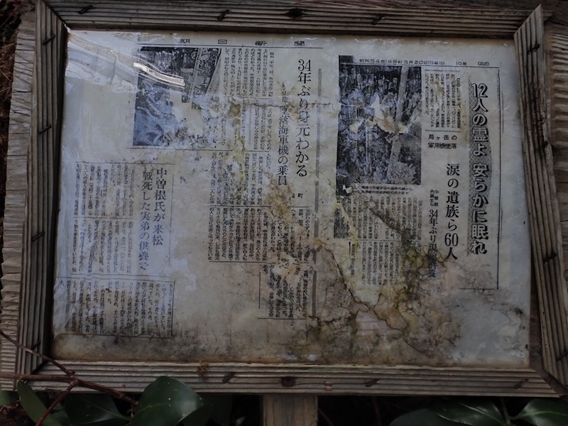 朽ちた看板や説明書きがあるので読むと、「終戦直前の昭和20年3月に海軍軍用輸送機がここに墜落し昭和54年に全搭乗員の身元がわかり現地供養が行われた。」という新聞記事が貼ってあった。
