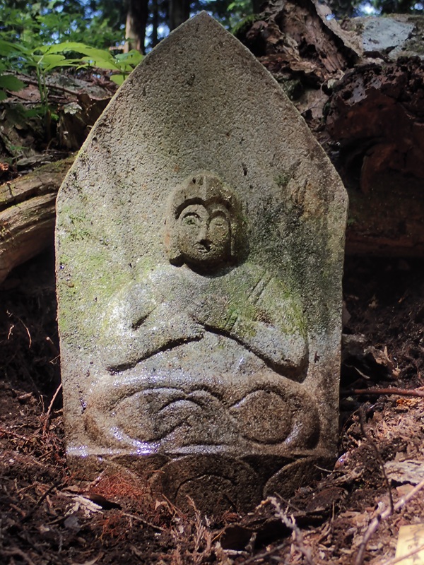 P756の左側をトラバースしたあたりに四角い石柱が倒れている。何かなと思い起こすと、僧侶の彫られた石仏だった。石仏の先が土に埋もれ下部の四角い部分だけ顔を出していた。奥の台座の辺りを掘り返すと根っこが何重にも重なった土の下に台座が現れた。台座をスコップできれいにして、石仏を直しておいた。石仏には「山伏往来」の文字もあり修験の行者が建てた物のようだ。