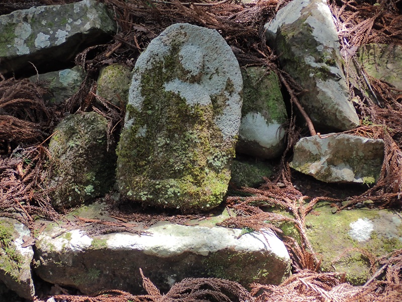 最後は伐採時のキャタピラ道で軟着陸した。取りつき地点がこの状態では、立派な牛道があっても歩く人はおらず石仏が倒れたまま放置されていたのだろう。