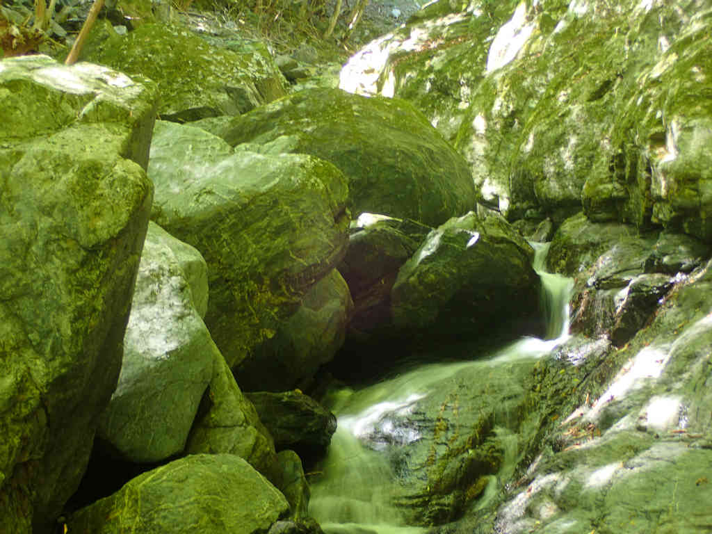 核心部を越えてもまだゴルジュの中だ。流れに逆らって泳ぐ。水量は少なくても,狭いゴルジュなので流れはそれなりにある。登れない滝は左岸のバンドを伝って通過。ようやくゴルジュから脱出できた。ああ,面白かった。