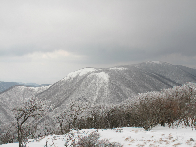 頭陀ヶ平では樹氷が見られた。御池岳が正面に見えるもののテーブルランドはガスで見えない。樹氷のついた藤原岳天狗岩方面がよく見える。あの日は日本海方面から沢山雲が流れてましたし、すっきり晴れてはくれませんでしたね。