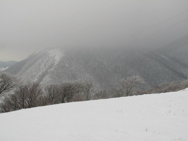 関係ないけど「ほう」と「ひ」が口に化けますね、何かした?中電小屋手前の吹溜まり地帯もたいして沈み込むことなく通過。真っ白な霊仙岳が見えるものの伊吹山は姿すら見えなかった。そして、左手に鉄塔を見ながら上って行く。次の鉄塔からは県境稜線が目の前に見える。同じラインの鉄塔が右手に見えるが頭陀ヶ平の鉄塔は左手の方だ。ここからの上りではスノーシューが力を発揮してくれる。ここも吹き溜まる場所だが、最後の頑張りどころ。結局ここから天狗岩までトレースは無かった。鉄塔に向かって上っていると、下の鉄塔付近に本日第一号の人発見。スキーをつけて上ってきたようだ。男性はしばらく考えて右手の鉄塔に上がっていった。