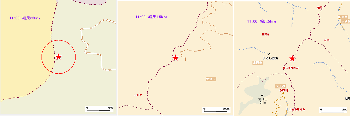 縮尺は詳細が350m~全国までの6段階で表示可能です。