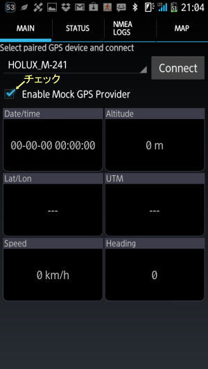 「connect」をタップ(HOLUXが取得したGPSデータが表示される)