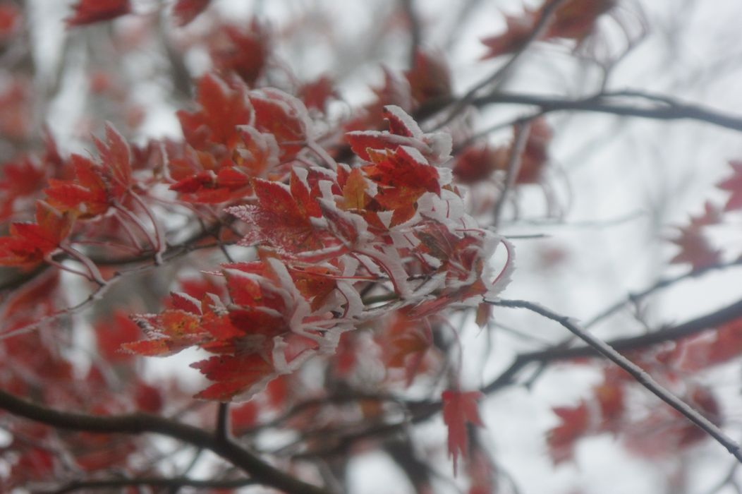 真っ赤なモミジの葉に霧氷が付いているのを見る機会は少ないような気がします。