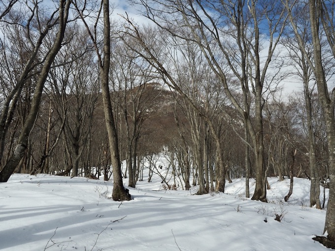 >co1170mの台地は青空に突き刺さるような明るいブナ林で、樹間からの眺望もマズマズ。いきなり雪も多くなり、