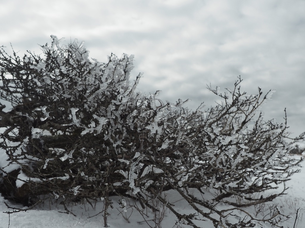 霧氷のあるものはすっかり透明になって、ガラス細工が樹にまとわりついているかのようだ。おそらく前日の陽光に照らされて雪が半ば融解した状態で再び結氷したためだろう。迂闊にも樹に袖が触れると、ガラス細工のように透明な霧氷は一瞬にして雪の上に硬い音を立てて落下する。残りの霧氷もわずかばかりの風が吹くと儚く落下する運命なのであろうが、何故か霧氷に悪いことをしてしまったような気がした。