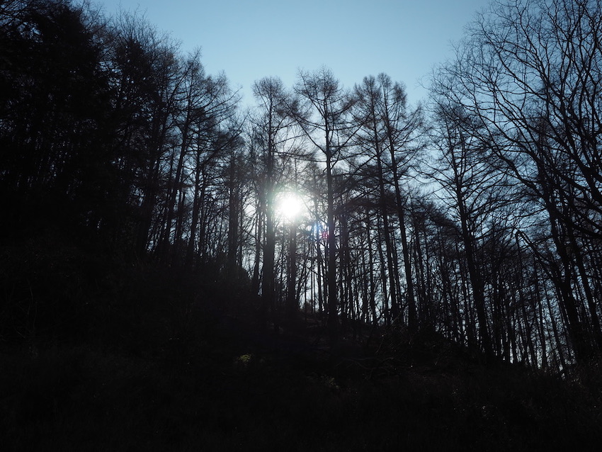 古道の上には丈の高い熊笹の藪に埋もれてゆくが、その先の右手の斜面には美しい落葉松の樹林が現れる。折しも朝陽による逆光の中、落葉松の中を鹿の家族連れがゆっくりと登ってゆく。写真に収めることの出来ない一瞬ではあったが、そのシルエットに秘められた神々しさは心象に深く投射されるような気がした。