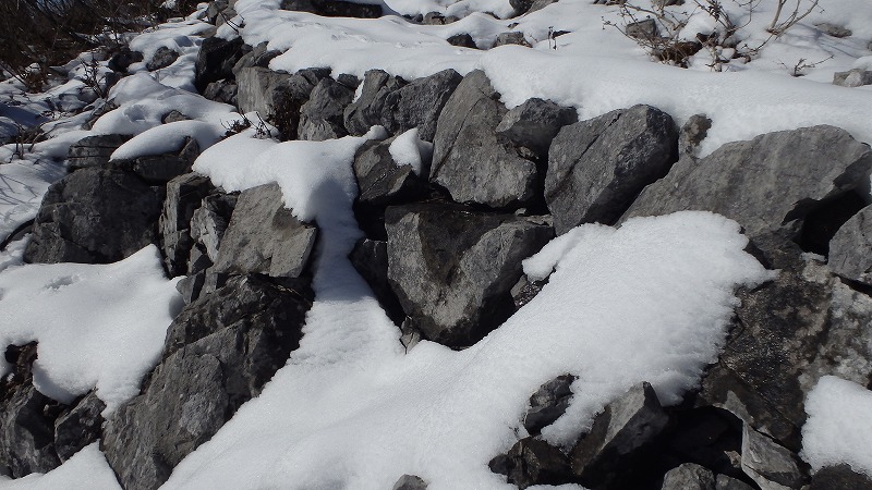 やがて折り返しの古道の道が視界に入ると安堵の胸をなでおろす。下から見上げても道筋が容易には見分けがつくほどに古道はカレンフェルトの石を丁寧に積みあげて造られたもののようだ。道が容易に同定出来たのは寡雪が幸いしたように思う。雪のせいでこの古道を辿ることが出来なかったbiwa爺はこの斜面を登るのにいかに難儀したことかとその苦労が思いやられる。