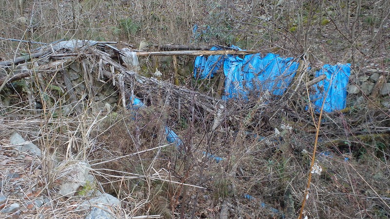 堰堤の東詰は尾根が逆Y字に分かれていますね。私は向かって右の枝尾根を下ったので、微妙にズレたんでしょう。逆Y字の真ん中にブルーシートと廃構がありました。河原からちょっと入ったところ。