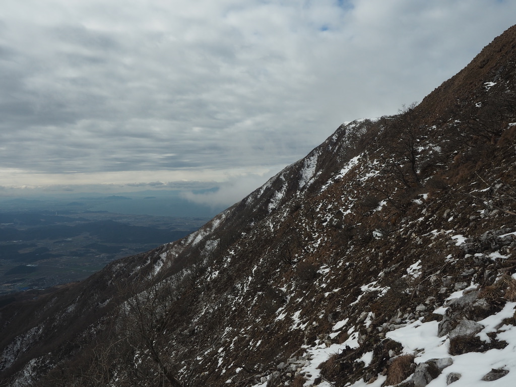 ガスはいっこうに晴れる気配もなく、山頂を辞すと早々に南尾根を下り始める。カレンフェルトの岩の間にはわずかばかりの雪があり、白黒を反転した豹紋のような斑点が斜面一面に広がっている。山頂からわずかに下るとすぐにも雲の下となり、風もなく暖かい空気に包まれる。南尾根の草木のないカレンフェルトの尾根からは琵琶湖を右手に望む壮大な展望がなんといっても魅力だ。この日のランチ休憩はこの南尾根でと決めていた。