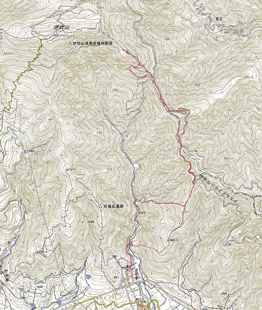 【 ルート 】上平寺登山口9:14〜9:55点標上平寺〜10:58南東尾根取付き〜11:40ca1170m〜12:10伊吹山山頂〜13:27弥高寺跡〜13:58弥高尾根入口(林道分岐)〜14:47近江長岡駅