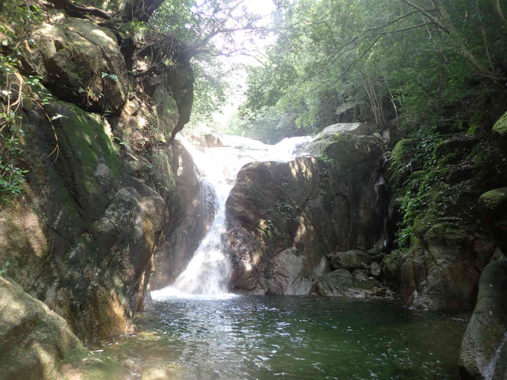 しばらく滝を愛でて下山にかかる。石谷川は登山道がすぐ脇を通っているので下山は楽である。1時間ほどで大堰堤に到着。大堰堤の下に降りるとキャニオニングツアーのガイドたち6人が技術研修をしていた。その脇を通り過ぎ,渡渉して,石水溪バンガロー村に至る登山道に入る。いつもはこのままバンガロー村に降りるのだが,今回は左折して望仙荘に向かう。キャニオニングツアーの人たちが設置した入渓ルートを確認するためだ。苦もなく望仙荘脇に出る。