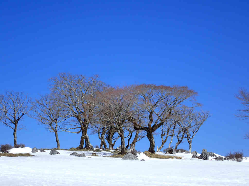 「ゲートが閉まっていても自転車で登山口まで行けば大丈夫だろう」。車に自転車を積んでいく。ゲートの手前に車を置き,自転車で林道を走り始める。車で走っているときはほぼ平坦に思えた林道も微妙に登り勾配なことに気がついた。きつくなると自転車を降りて歩いて行く。「この分,帰りは楽できるだろう」。結局,入山口の小又谷駐車場まで25分かかった。 駐車場からはノタノ坂方面に入っていく。峠までは植林帯。峠から左折し尾根道をたどるが,送電線の巡視路が歩きやすいように九十九折れに付けられているので楽に登ることができる。co900m付近でようやく雪が出てきた。周囲は自然林となり,太いブナも出てきて雰囲気がいい。右手には藤原岳の西尾根が見え,登山ルート上だけ雪が残って白い帯状に見える。 峠から1時間半弱で土倉岳着。のっぺりと広い頂上だ。これから目指す御池テーブルランドを眺めながら一休み。テーブルランドの斜面にはまだらに雪が残りいかにも早春の表情を見せている。ここから見上げるテーブルランドは雄大で,素敵だ。休んでいるとテーブルランド方面から落石の音が聞こえてくる。おそらく岩の間で凍結していた水分が融解して,緩んだ岩が落ちているのだろう。 つり尾根を少し下り,斜面に取り付く。水分を含んだ雪解け期の斜面は滑りやすいが,気をつけて登ればさほど苦労はしなかった。20分ほどでテーブルランドの南端に到達する。台地上はさすがにまだ雪に一面覆われているが,雪の表面は日にてられてシャーベット上である。しかし,つぼ足でもそれほど潜らないので,登山靴だけで快適に歩くことができる。ここまで来る登山者も少ないのだろう,雪面は荒らされていない。 青のドリーネの近くに腰を据えて昼食休憩。こんな素敵な風景を独り占めできていい気分だ。時間は十分にあるので近くを歩いてみる。琵琶湖の向こうに比良の山々が白く見えている。その手前にはこれから歩く予定の丁字尾根と,まだ登ったことがない天狗堂が。南の方向には,綿向山,雨乞岳,御在所岳,鎌ヶ岳など鈴鹿の主稜線が見えている。