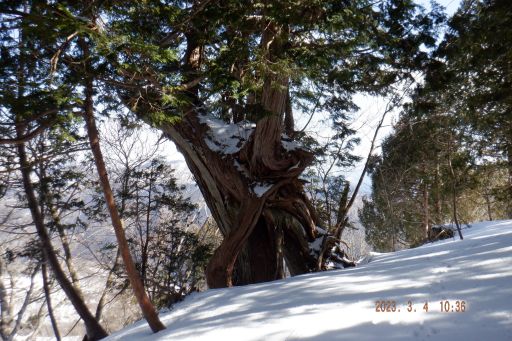 この辺り一帯の特徴でしょうか小ピークには大きな檜が鎮座しています。雰囲気も良くなて来た。豪雪地帯を生き抜いた木はさぞ立派でしょうね。