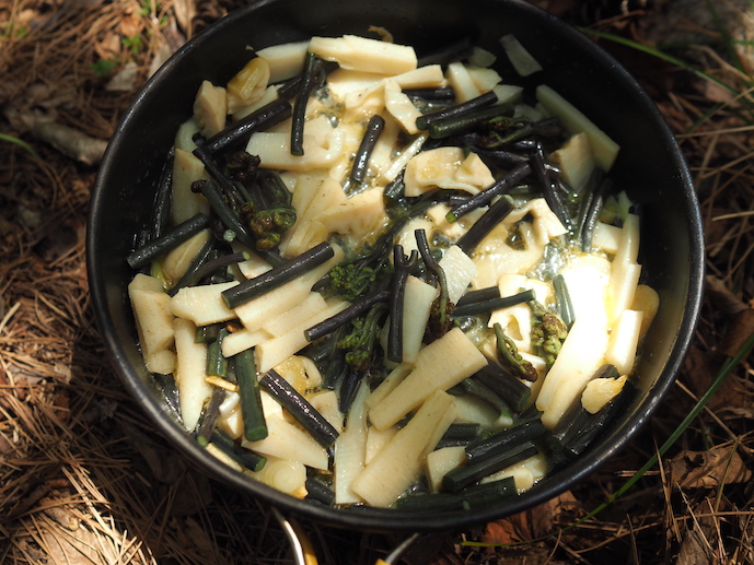 採取した蕨が生きましたね。下の方からは再びバイクの音が聞こえてくる。新緑の樹林の中を走り回っているのだろう。この日はガーリックをオリーブオイルで炒めたところにバターを加え、蕨と筍をソテーする。そこにライスとハナビラタケを投入して山菜リゾットを作る。