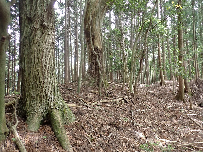 破線道は続いており今も歩く人はいるようだが牛道ではない。どこにあるんだと思いながら歩くが県境稜線は目の前だ。すると突然牛道があらわれた。高低差を抑えた溝道が稜線の下を走っている。月出側をたどると破線道の東側の斜面に向かっている。こちらの探索は帰りにして、この先をたどる。牛道は稜線の南側を通り稜線に出た後、稜線の北側を走っている。稜線のアップダウンを避けた牛道らしい賢い作りだ。稜線をまたぐ所が白髪峠で、ミズナラの枯れた古木が立っている。大日様が根元に埋もれていた。峠は直角に乗越す峠ではなく、稜線をかすかに横切る形の峠になっている。破線道がクランクになってつながっている意味がわかった。ここは牛道の峠であり、稜線をそのまま歩いたのでは峠の意味はわからないだろう。牛道はトラバースしながら御杖村菅野につながる破線道の尾根に向かっている。1カ所道が落ちているが、その先もつながっている。植林の杣道として使われているようだ。急な斜面では九十九折に道はつけられ切通も出てきた。高低差の無いなんとも快適な道だ。登山道になっている破線道と交差するが高低差の無い方が牛道で、昔人の知恵がつまっている。牛道の事を知らなければただの杣道にしか見えないだろう。
