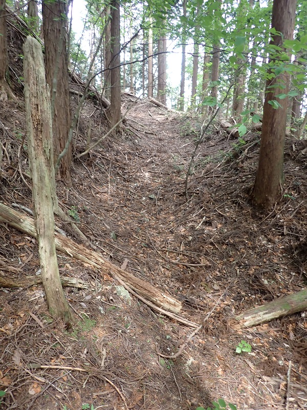 杣道が林道から続いておりここを上る。植林の金網があり尾根の端を歩くしかない。大岩があるあたりで金網は途切れ、尾根芯を歩く。杣道は続き破線道は生きている。上の林道に着くと、目の前に巨大なのり面が出てきて上れない。上部にも植林が続いているので、上れそうな所を探すと、少し下った所にあるキャタピラ道から取り付けそうだ。獣道をつないで慎重に尾根芯を目指す。尾根は広がり歩きやすくなり破線道は杣道としてつながっている。神武天皇が東征の際に、あまりの大変さに白髪になったという伝説のある峠だけにゆるやかな尾根ではない。