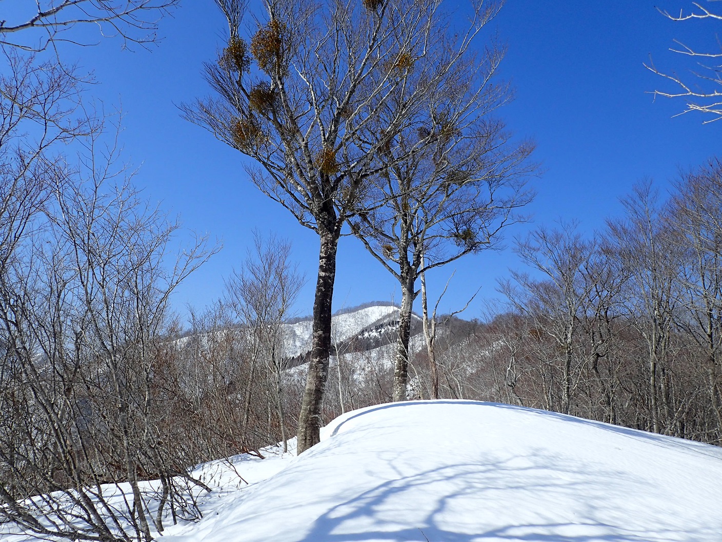 登山口からスノーシュー装着。全面雪だが、低木の隙間を縫う。登るにつれ気持ちよく歩けるようになり、樹間から左手に屏風山、左門岳といった県境の山。右手には縫ヶ原山の稜線が見えたと思ったら、その斜め後ろに荒島岳だ。そのうち、能郷白山、加賀白山も見えてきた。なかなか良い山だ。頂上は樹木で展望が少し遮られるが、立ち位置ごとにあっちこっちが見渡せる。