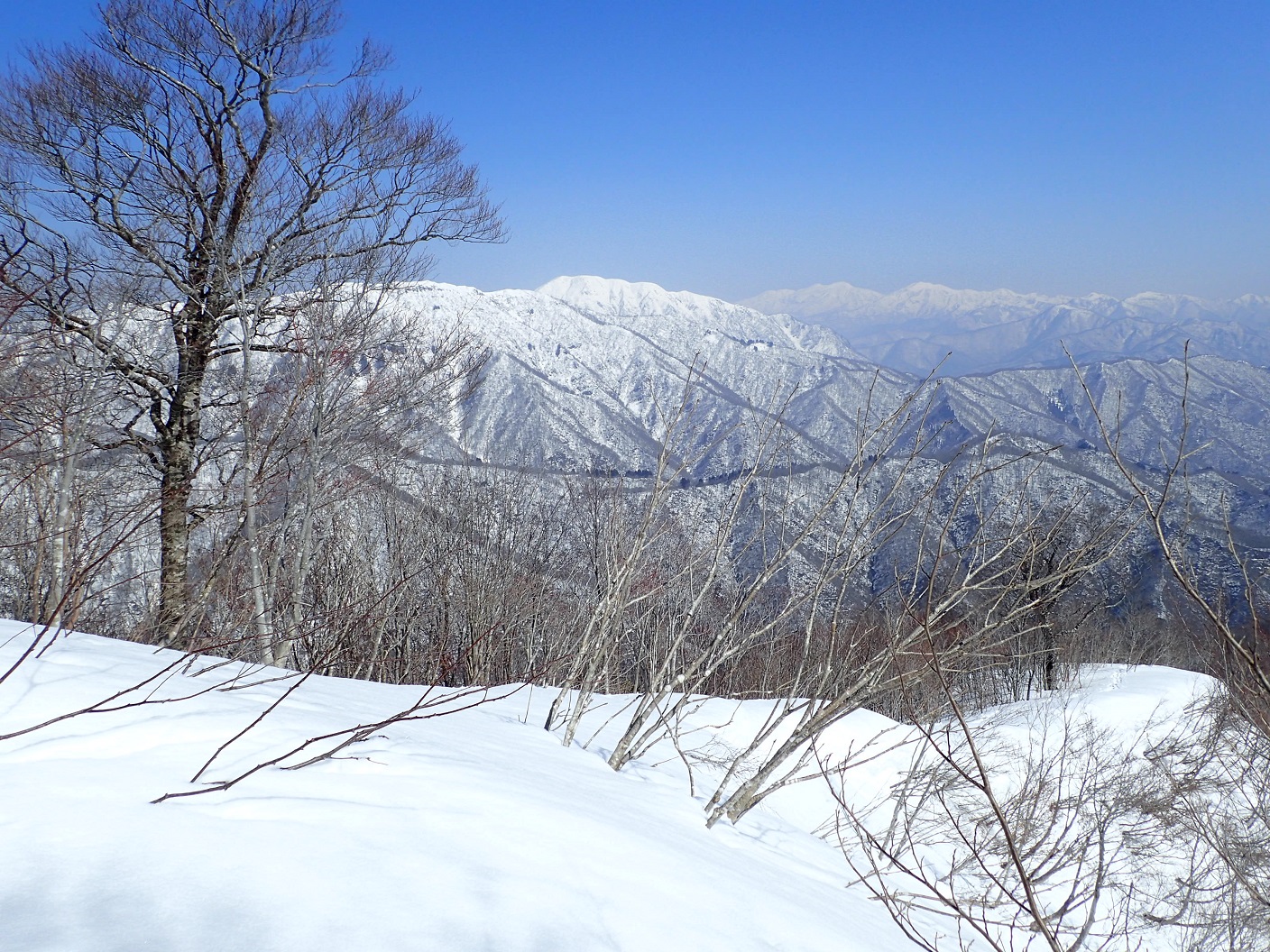 登山口からスノーシュー装着。全面雪だが、低木の隙間を縫う。登るにつれ気持ちよく歩けるようになり、樹間から左手に屏風山、左門岳といった県境の山。右手には縫ヶ原山の稜線が見えたと思ったら、その斜め後ろに荒島岳だ。そのうち、能郷白山、加賀白山も見えてきた。なかなか良い山だ。