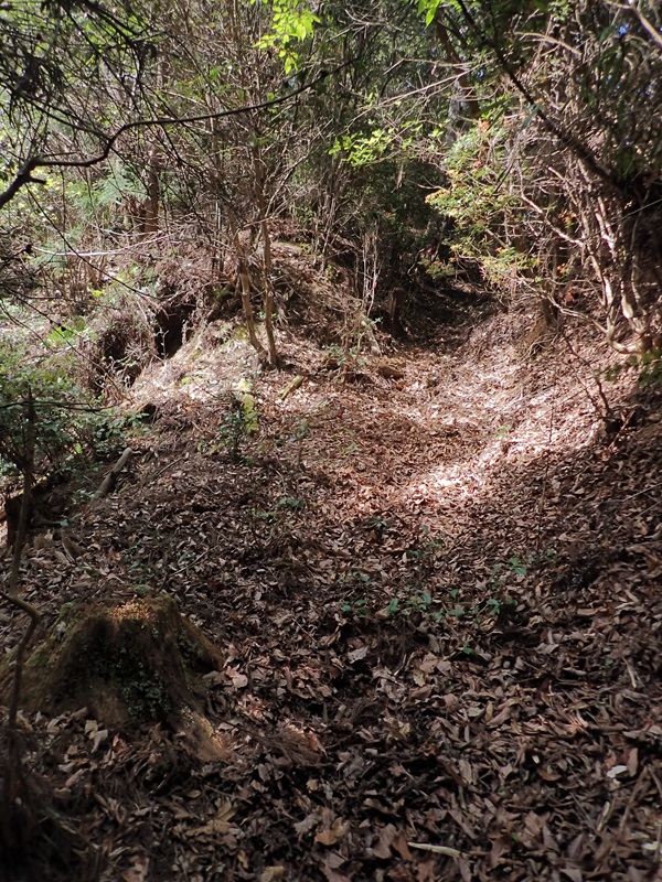 ゴミを燃やしている老人に話を聞くと、峠の祠には小学校の頃に行ったことがあり当時は祭りもしていたそうだ。この話を聞いて、もう一度上り返すことにした。紀州街道は、下向から二俣に向けて東に延びた途中で切れている道沿いから上ったようなので、広い道をもどり紀州街道と交差する尾根のあたりを探る。このあたりにおれん茶屋があったようなので探るが目印となる大岩が見つからない。探していると少し上に広い道があるので、追うと祠のある大定峠に着いた。峠は鞍部の上の尾根が広がった場所を越えていた。