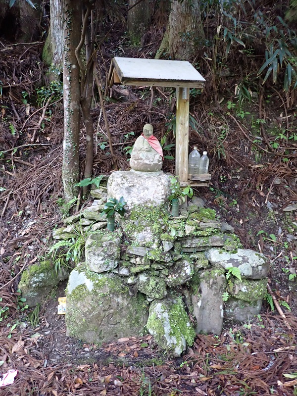 街道が櫛田川を離れ高見峠に向かう落方の分岐には地蔵がありその下が道標になっている。土に埋もれかけた石の上部に「右こうや左いせ」の文字の一部が見える。舟戸への道を進むと伐採地に看板があり、松浦武四郎(北海道の名付け親)が泊まった長野屋跡と書かれている。「人気の素朴なるを感じぬ」と日記に記された言葉がそえられてあった。伊勢側の玄関口舟戸には以前は4件の旅籠があったようだが、今は静かな谷あいの集落だ。公民館の前には注連縄がつけられた祠がありその前には竹でシキミを進ぜる花立が組まれている。猿田彦さんと呼ばれている石像で、舟戸の人にとってここは特別な存在のようだ。隣の墓地には舟形の板状の板五輪と言われる五輪塔が並んでいる。小さな五輪塔を左右に置いた祠には双体地蔵が納められおり、「志州鳥羽領坂手邑 佐次良」と刻まれた行き倒れ供養の墓石もある。ここには、高見越をした人々の痕跡がしっかりと残っている。最後の民家の手前に素朴な味わいの地蔵と板五輪、前傾した腰折れ地蔵がある。どれもが市井の人々の息づかいを感じさせてくれる。