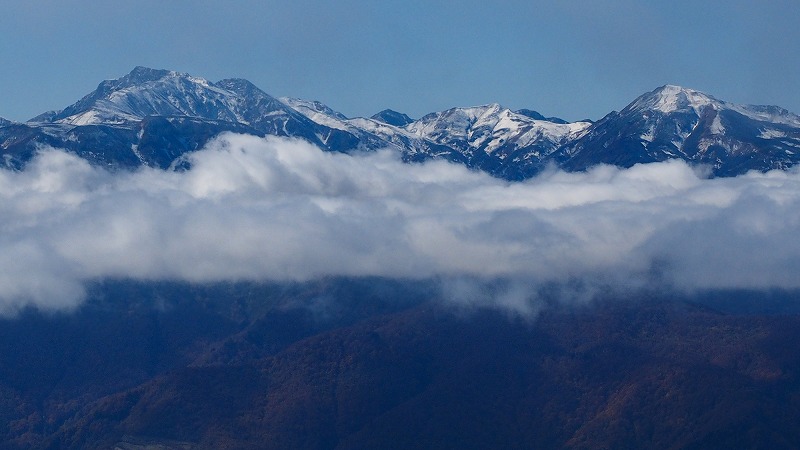 高妻、乙妻・・そして、西方には雪をかぶった北アの山々が雲の上に浮かんでいる。