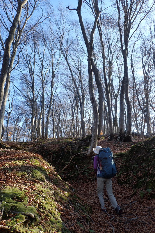 素晴らしいブナの林の尾根に丁寧に掘られた道。深いところではわたしの背丈以上もある。