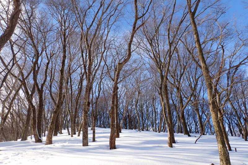 雑木林ばかりだった林相は徐々にブナ混じりの森となる。この県境稜線への登りはお気に入りの場所だ。雪は徐々に増え、50センチは超えているだろう。風が雪面に描き出した風紋が陽光にキラキラと輝いて美しい。