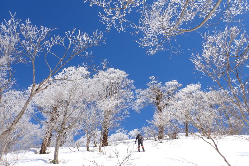 立ち木のほとんどない大斜面に取付くと、再び霧氷が復活して、美濃俣丸へのエピローグに彩りを添えてくれる。