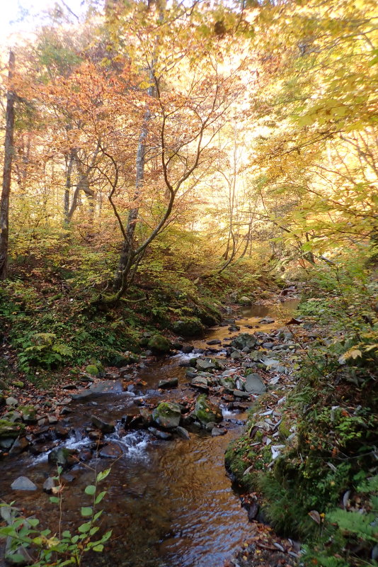 蝿帽子を歩くなら紅葉の時期と決めていました。この時までそれほど強い思い入れがあったわけではないんだけど、若谷の下りで意外な森の素晴らしさに触れて、蝿帽子川もきっと同じようなんだろうという思いが湧いてきました。