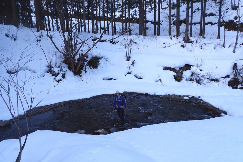 いきなり股まで潜って前進不能となった。再び履き直して、少し薄暗くなってきた植林の中を歩く。