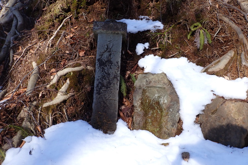 ・827から下った鞍部では、雪が少なかったおかげで、お地蔵さまに出会えて感激しました。この鞍部は、上杉喜寿さんの『峠のルーツ』によると、越戸峠と呼ばれ、明治の初めまで、