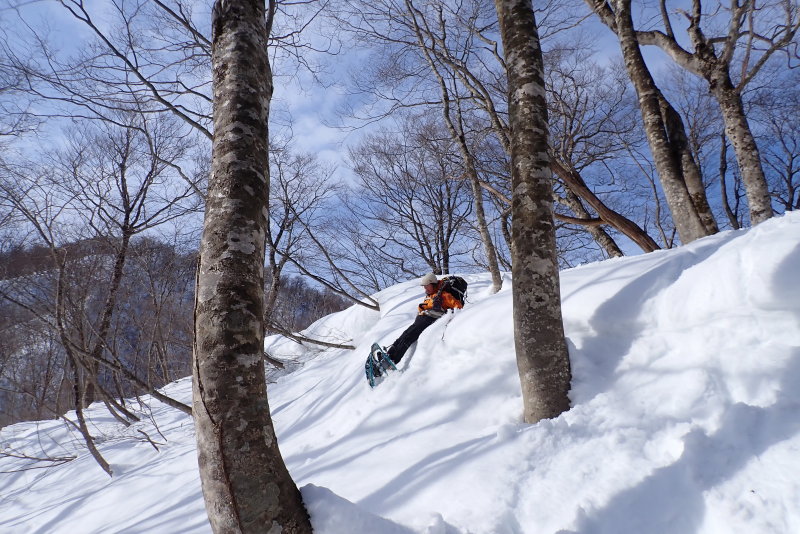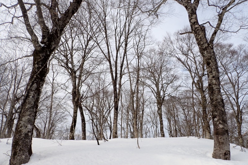 北側に大きな雪堤を張り出した尾根を進む。このあたりはそこそこのブナやミズナラも多く見られて林相は