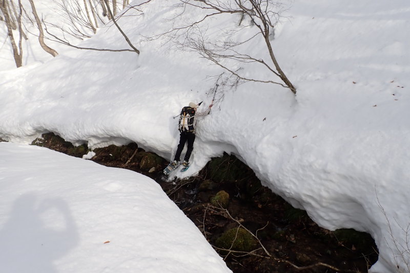 鞍部からボブスレーコースのような細い雪の溝になった谷を下ると、すぐに大納越戸谷の本流に合流した。