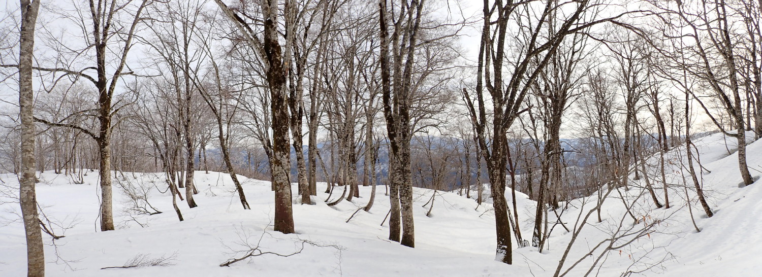 雪の多い時なら、山頂へ至るワクワクするような雪稜を「動」とすれば、この台地は穏やかな「静」の魅力にあふれています。