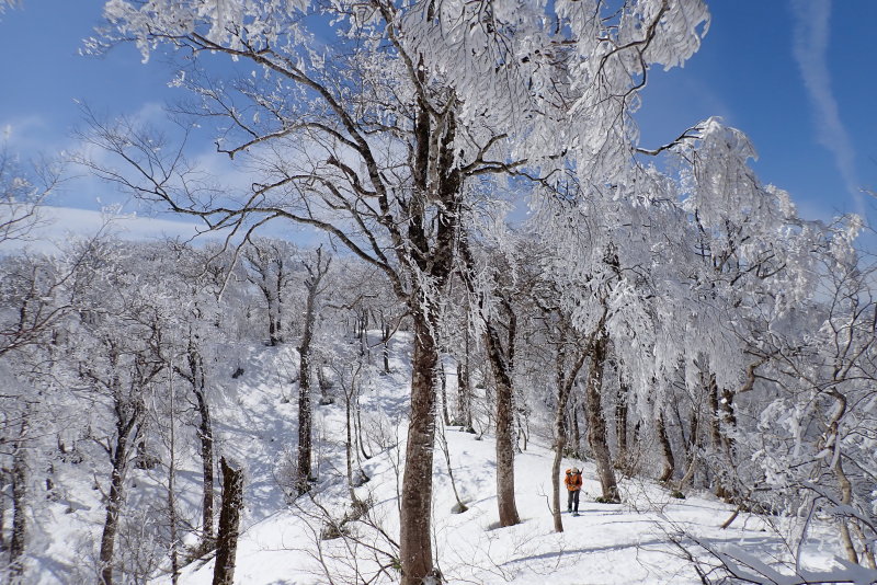 下りはツボ足で。楽しみにしていた、・1153から下ったゆるやかに広がる地形も、素晴らしかったです。ガラス細工のような霧氷も残っていてうれしかったです。