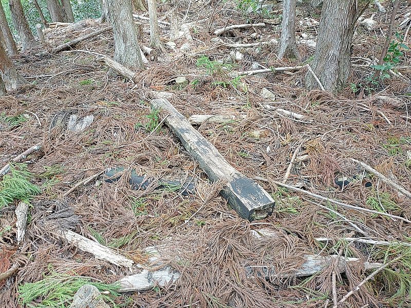 崩された土の急斜面登ると、広い平場があり製材された木が少し、落ち葉や枝が多く地面が見えていません。