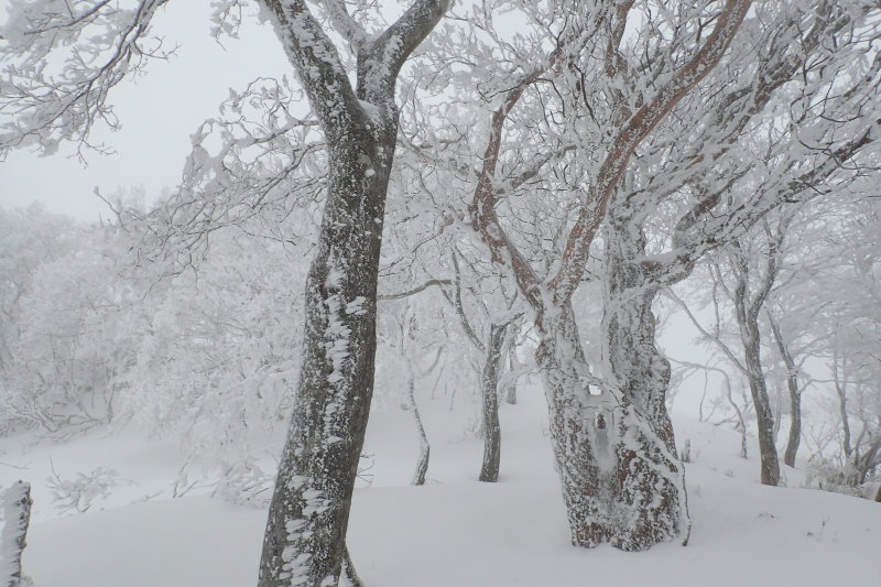 霧氷満開のブナ林を抜けると唐突に雪原に飛び出した。山頂の南端である。