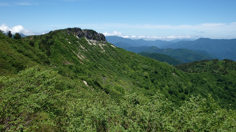 ピークから目の前に真っすぐな稜線が上まで伸びる。いやにヤセ尾根に見えるが、これも近寄ればたいした危険性もない尾根道だ。
