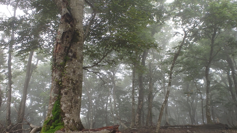 ここからの眺望はいいはずだが、今日は遠くの山々は360度雲に隠れて、近くしか見えない。ガスに煙るブナがいい感じだな…と思っていたら、急に雨粒が当たりだした。最近、濡れづいているので本降りになったらヤバイ! 休憩もそこそこに雨具を付け、下山に。