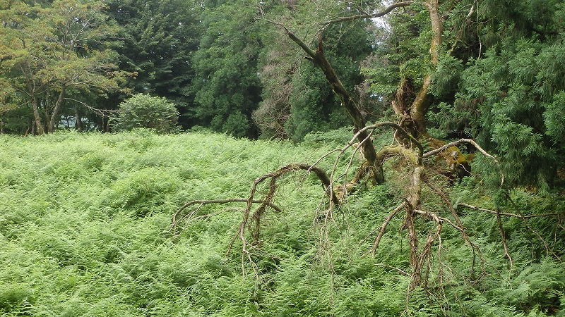 林道跡に拘らず植林帯に入るとさすがに草ヤブはない。そのまま「池」にむかって進むと、草に覆われた窪地があった。20m×30mくらいか? 水面は無いのか見えないだけなのか? 守り神のような怪木が手を振り上げて待ち構えている。