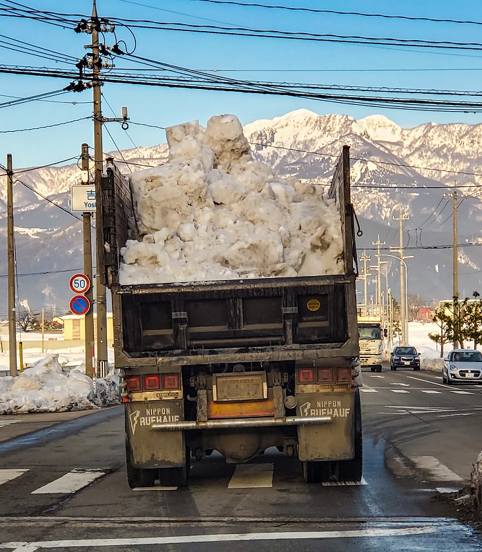 板を担いで圧雪の道路端を歩いていると、対抗で来た軽ワゴンが道の真ん中に停車して運転していた男性が