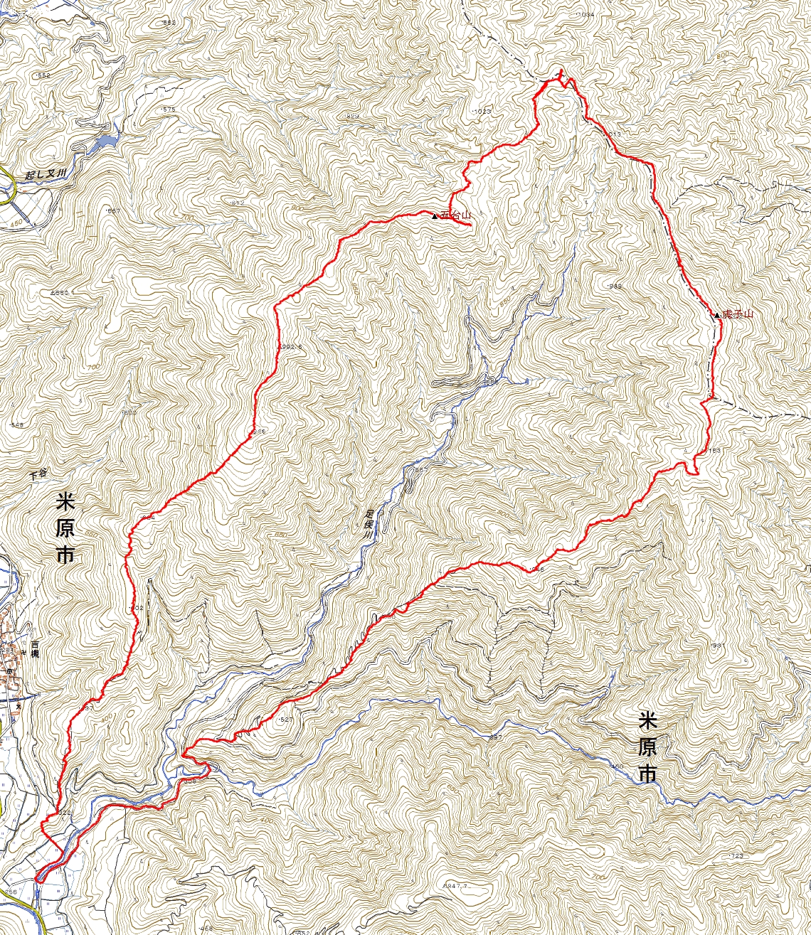 草川さんの五台山紹介は、「吉槻集落の北はずれ、下谷の左岸に沿う尾根」から登っているが、それだと虎子山から西尾根を辿って下りて来てから車道を歩いて駐車地に戻らなくてはならい。そこで、足俣川の出合近くから右岸尾根を上がって周回し左岸尾根を下りて戻ることにした。